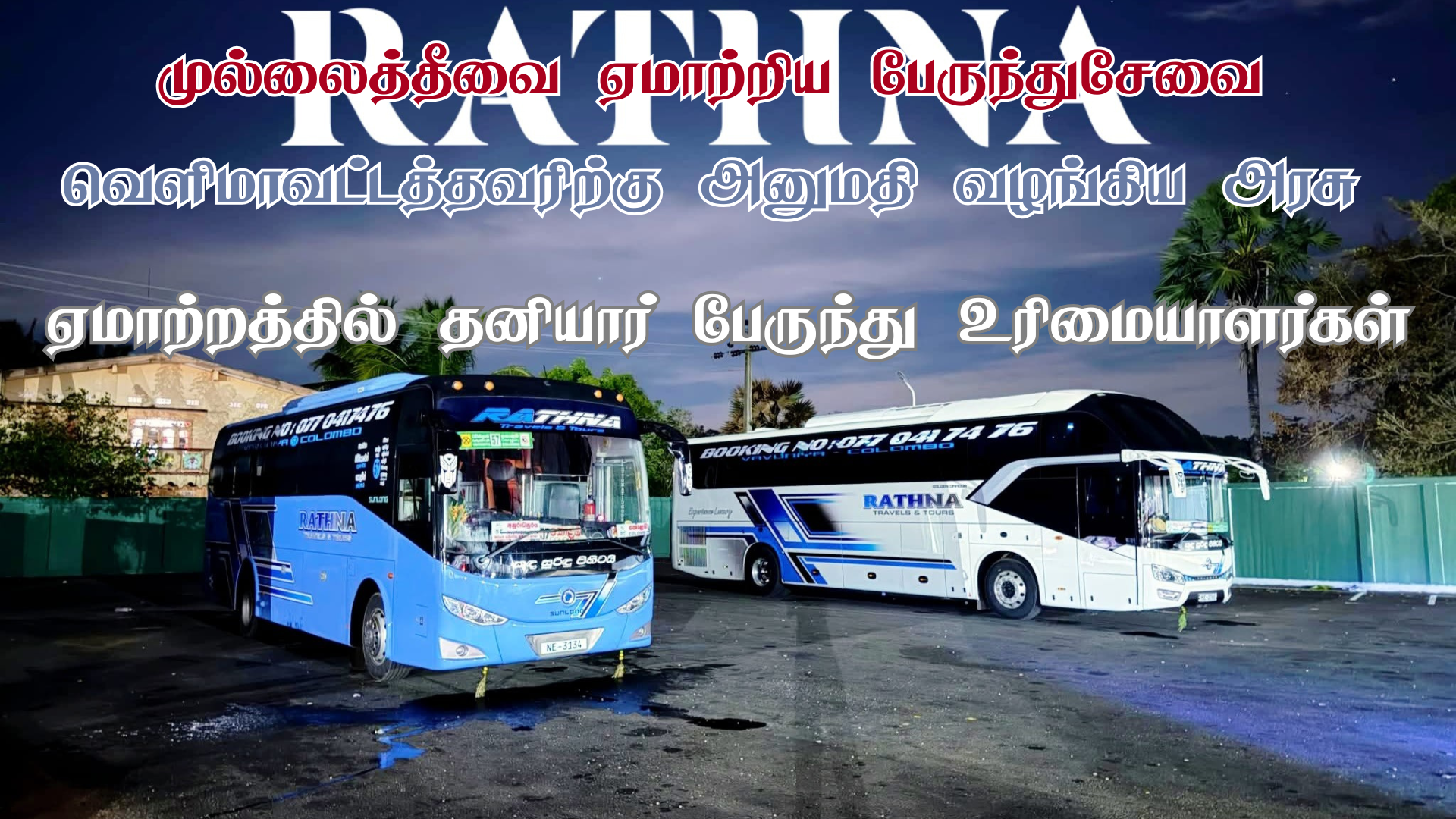 முல்லைத்தீவு மாவட்டத்தில் என்தனை கோடி பணம் செலவு செய்தும் சொகுசு பேருந்தினை கொள்வனவு செய்வதற்கும் பேருந்து உரிமையாளர்கள் இருக்கின்றார்கள் முல்லைத்தீவு மாவட்ட தனியார் பேருந்து உரிமையாளரிடம் சகல வசதிவாய்ப்புக்களும் உள்ள நிலையில் வெளிமாவட்டத்தினை சேர்ந்தவருக்கு இந்த வீதி அனுமதியினை அனுர தலைமையிலான அரசாங்கம் வழங்கியுள்ளமை முல்லைத்தீவு மாவட்ட மக்களுக்கு கவலையளிக்கும் செயலாக அமைந்துள்ளதாக பேருந்;தின் சாரதி ஒருவர் தெரிவித்துள்ளார்.