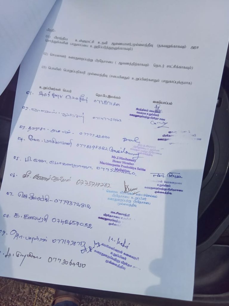 இந்த கோரிக்கை மனுவானது பிராந்திய உள்ளுராட்சி உதவி ஆணையாளர்மற்றும் கரைத்துறைப்பற்று பிரதேச சபை செயலாளர் மற்றும் முல்லைத்தீவு பொலீஸ் நிலைய பொறுப்பதிகாரி ஆகியோருக்கு அனுப்பிவைக்கப்பட்டுள்ளது
