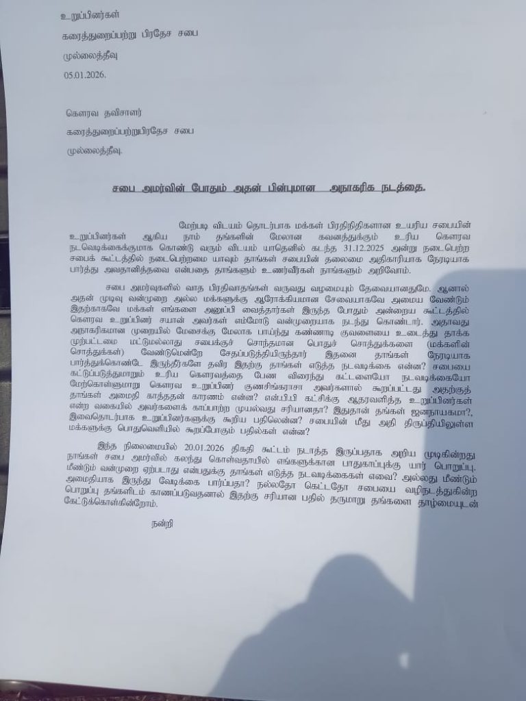 என்பதுடன் எதிர்வரும் 20.01.2026 அன்று கரைத்துறைப்பற்று பிரதேச சபை கூட்டம் நடத்த தீர்மானிக்கப்பட்டுள்ளது நாங்கள் சபையில் கலந்துகொள்வதாயின் எங்களுக்கான பாதுகாப்புக்கு யார்பொறுப்பு மீண்டும் வன்முறை ஏற்படாது என்பதற்கு தாங்கள் எடுத்த நடவடிக்கைககள் எவை? அல்லது மீண்டும் அமைதியாக இருந்து வேடிக்கை பார்ப்பதா நல்லதோ கெட்டதோ சபையை வழிநடத்துகின்ற தவிசாளரிடம் காணப்படுவதால் இதற்கு சரியான பதில்தருமாறு கேட்டுக்கொள்கின்றோம் என்று 10 உறுப்பினர்கள் கையெழுத்து வைத்த கோரிக்கை மனு ஒன்று அனுப்பிவைக்கப்பட்டுள்ளது.